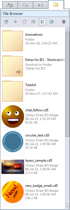 This is the File Browser tab; it allows you to easily navigate and load files. The home page of the file browser lists your drives, common folders of interest and the user favourite folders. The Chasys Photo default folder is also listed. You may open files and folders by clicking them. To add a file as a new layer in the image you are working on, right-click instead.