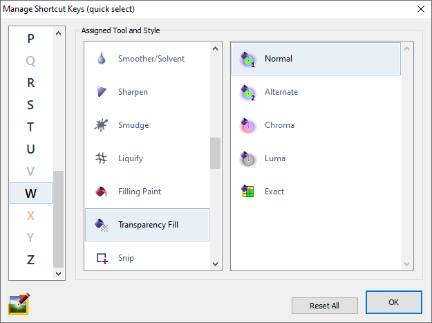 enable the Hand tool when using the default mappings. You can customize the mappings of quick-select from the Configure / Shortcut Keys menu: